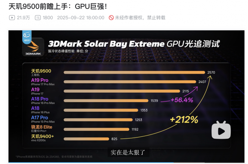 实际上,这颗GPU的光追性能确实提升巨大,Solar Bay Extreme甚至超过了2570分,一般是提升50%都已经很离谱了,天玑9500直接翻了3倍,实在是太狠了。