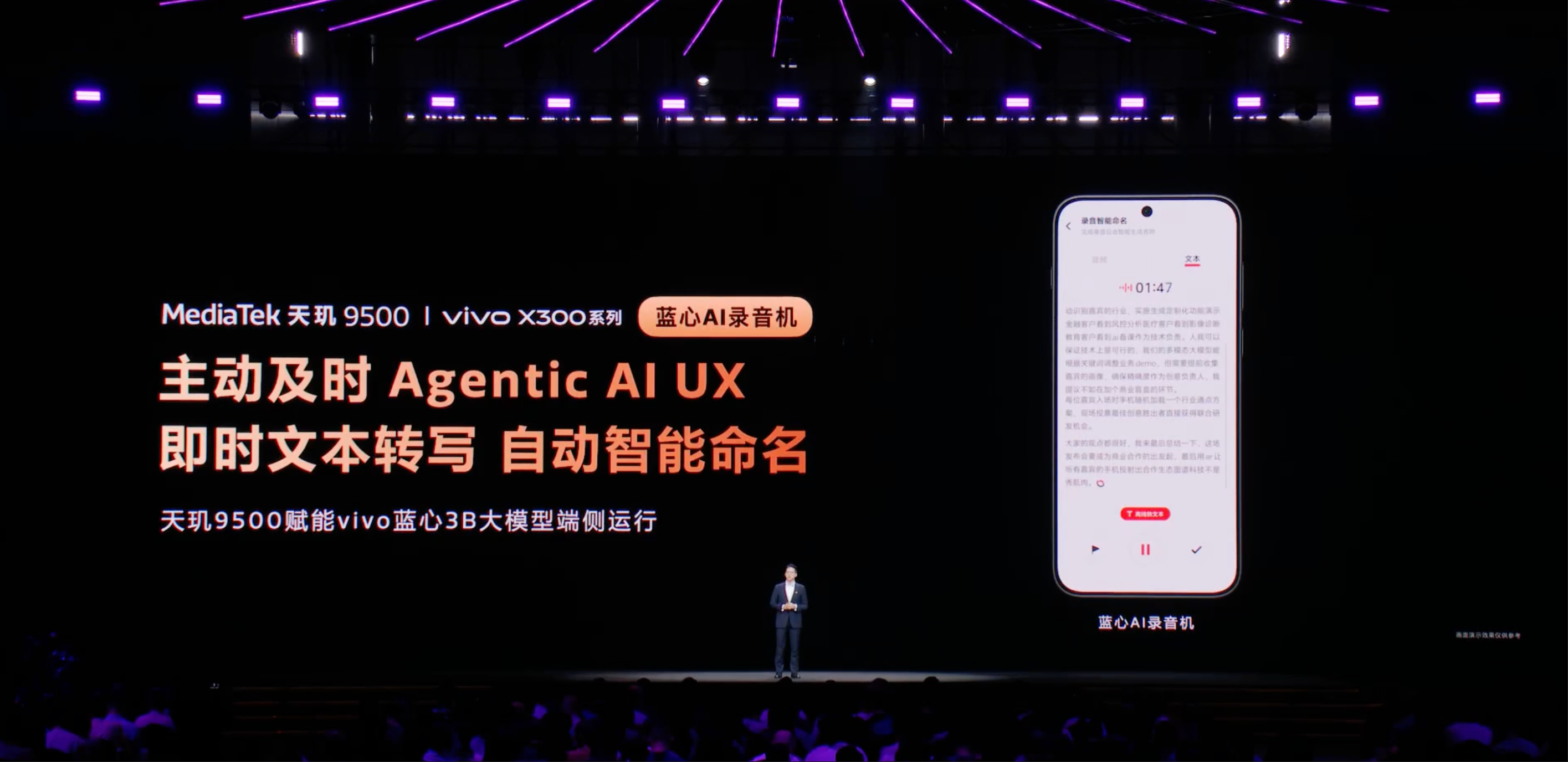 天玑始终是终端厂商的好伙伴,天玑9500将驱动vivo、OPPO的下一代旗舰新品X300系列及Find X9系列,带来主动及时的智慧体验。在天玑9500的发布会上,我们已经可以体验到蓝心AI录音机可全程离线转文本,并主动生成标题和总结。透过AI意图搜索,只需模糊指令即可一搜即得;小布识屏更能看懂屏幕内容,提供贴心智慧服务;AI还能记忆你最喜欢的风格,为你带来专属于你的模板。