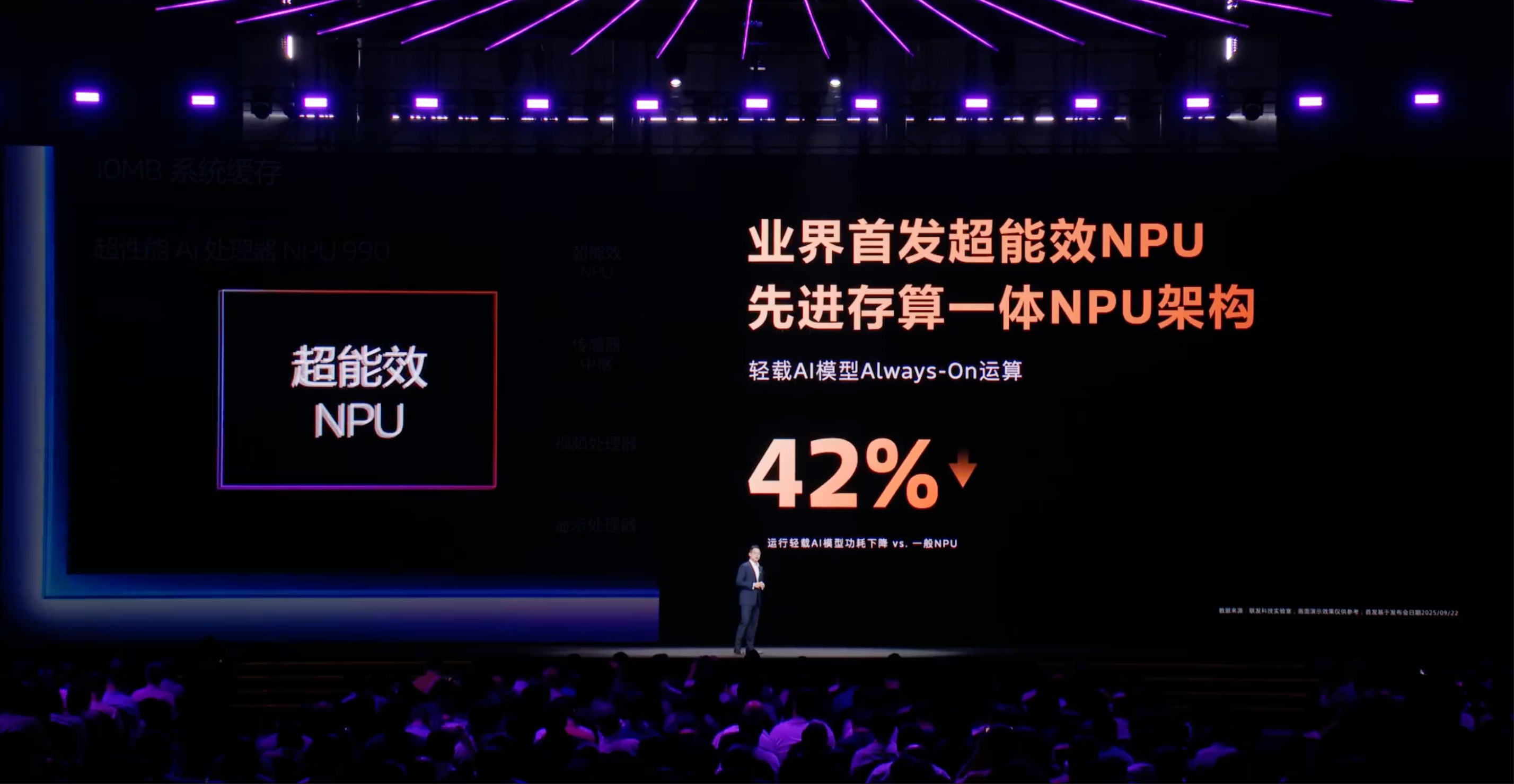其次,天玑9500搭载了业界首个超能效NPU,它采用先进的存算一体架构,可以让低功耗AI模型以极低功耗常驻运行(Always ON),运行时功耗降低42%,完美满足了全行业对AI全时在线的期待。
