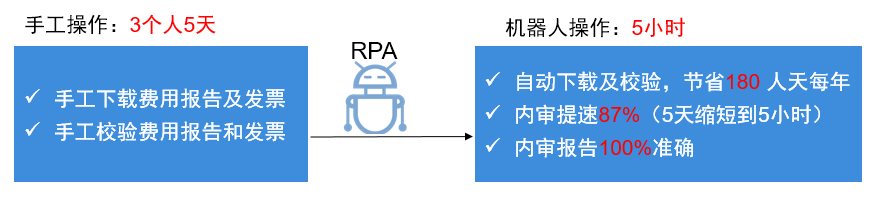 联想集团全球内审部门会不定期随机抽查N个员工N年的费用报销情况,平均涉及N张费用报告和若干张发票。在传统的人工内审模式中,公司需要3名员工每个月花费至少5天时间完成费用报告和发票的手工下载及校验。而在实施RPA后,机器人只需要5个小时便可完成同样的工作量,每年节省人力成本约1500小时。