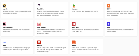 据官网的介绍,ChatGPT的第一批第三方插件包含11种类型,由Expedia、FiscalNote、Instacart、KAYAK、Klarna、Milo、Open Table、Shopify、Slack、Speak、Wolfram和Zapier建立。