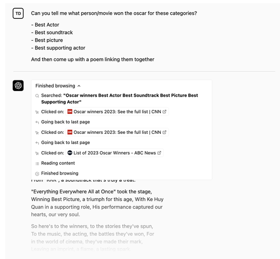 OpenAI提供的案例显示,向ChatGPT询问奥斯卡获奖信息,它能够回复2023年的最新数据。在此之前,ChatGPT无法跟踪2021年9月以后的信息,澎湃新闻此前在2月进行测试时,曾要求ChatGPT分析谷歌第四季度财报,但它提供了错误的业绩数据。