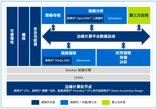 英特尔工业边缘洞见平台软件包针对基于英特尔架构的平台而创建和优化,并已针对基础操作系统进行了验证。其功能支持多个关键的边缘英特尔硬件组件,例如 CPU、FPGA、加速器和英特尔Movidius™ 视觉处理器(VPU)。而且,其模块化架构为 OEM、解决方案提供商和 ISV 提供了灵活性,以选择他们希望包括或扩展到定制解决方案的特性和功能。因此,他们可以将解决方案快速推向市场并加速客户部署。