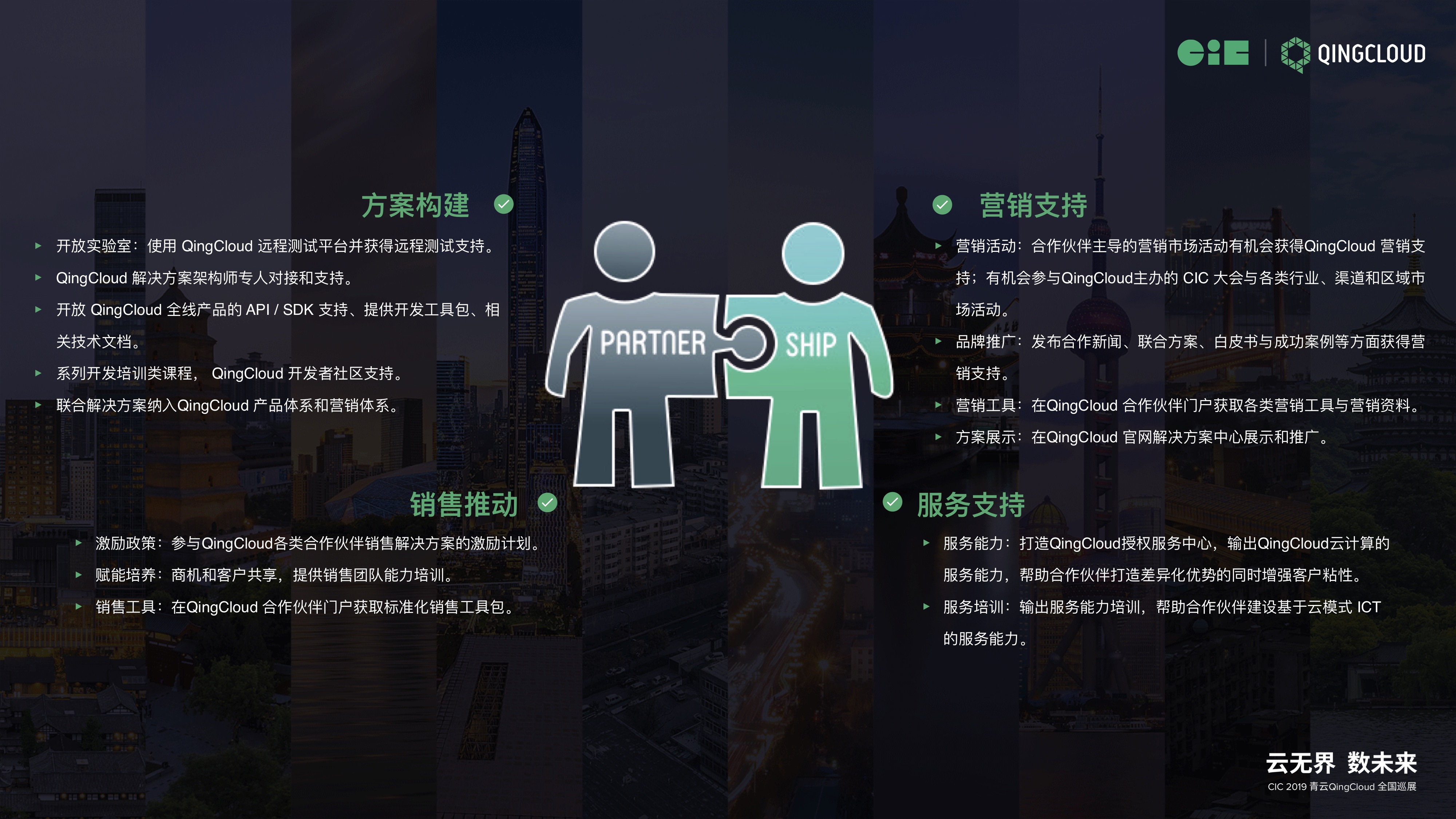 青云QingCloud认为数字世界一定是由企业、平台厂商和专业厂商三者共同实现的,缺一不可。并且,在数字化转型过程中,企业自身在其中扮演着重要的角色,作为提供平台的服务商和专业厂商都将是其中的关键。专业厂商既包括给企业开发应用的ISV,也包括在很多专门技术领域进行专业应用开发、工具开发的厂商。只有平台和专业厂商能力的互补和深度的整合才能给企业提供更加完整、更加场景化的解决方案。