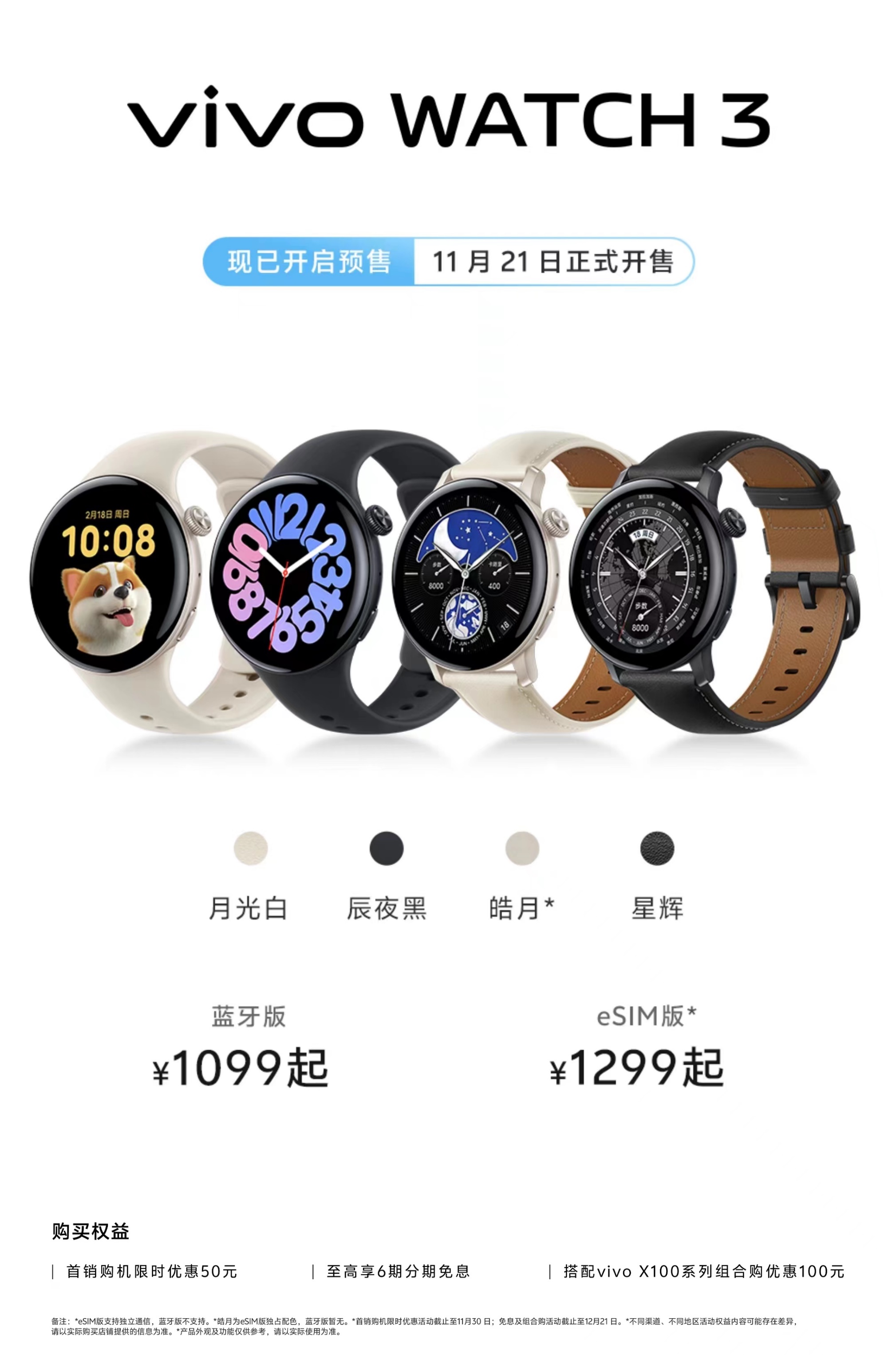 vivo WATCH 3现已开启火热预售,蓝牙版零售价1099元起,eSIM版1299元起,11月21日起将在vivo线下门店及vivo官网、京东、天猫、苏宁易购等各大电商平台正式开售,首销购机限时优惠50元,至高享6期分期免息,搭配X100系列组合购优惠100元。