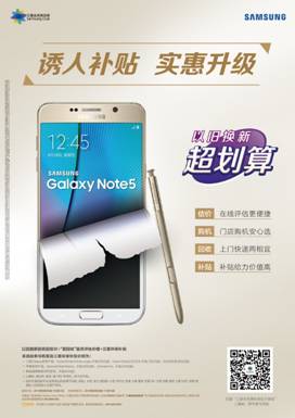 适逢中秋国庆假期将至,为回馈广大星粉们一直以来对于三星的喜爱和支持,三星官方计划于9月25日至10月30日期间推出针对Galaxy Note5机型的以旧换新活动。对消费者手中的多种旧款手机进行估值,折价换购拥有14nm工艺的八核Exynos7420处理器和 4GB LPDDR4 RAM内存的硬件配置的三星最新旗舰产品Galaxy Note5。