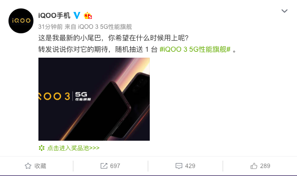 今天,iQOO官方微博放出一张海报,两台手机剪影配了一行非常简短的文字“iQOO 3 5G性能旗舰”,虽然没有特别明确的给出发布的具体时间,但可以肯定的是,这波官宣表明iQOO 3真的要来了。