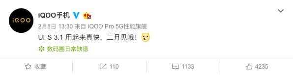 不仅如此,iQOO官博还在近期发布了一条“UFS 3.1 用起来真快,二月见哦!”的微博,进一步肯定了iQOO 3的即将到来,并将搭载UFS 3.1顶级闪存芯片的事实。这是继iQOO Neo 855版采用UFS 3.0闪存领先业界后的再次升级,进一步提升和巩固了iQOO 3的5G性能旗舰定位。