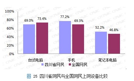 从上网方式来看,四川省网民对移动互联网有着较高的接收程度。四川省使用台式电脑上网的网民占整体网民的69.0%;而手机网民在总体网民中的比例从2010年末的76.2%提升一个百分点至77.2%,远远超越台式电脑,手机成为最重要的上网终端。