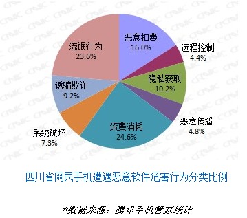 报告中引用了2011年腾讯手机管家检测到的四川省用户遭遇手机恶意软件情况,其中以资费消耗和流氓行为占比为24.6%和23.6%,最为常见;其次恶意扣费和隐私获取占比达到16.0%和10.2%。(注:大部分恶意软件同时存在多种危害行为,这里以总体用户遭遇的恶意软件的次数与包含的多种危害行为进行统计)