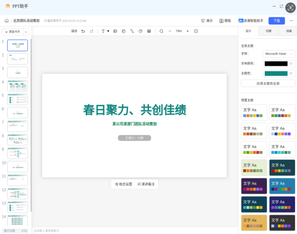 下一步,小杨使用智能PPT功能,输入团建策划框架,片刻后,直接输出团建报告PPT。调整一下语言准确性就可以汇报了。