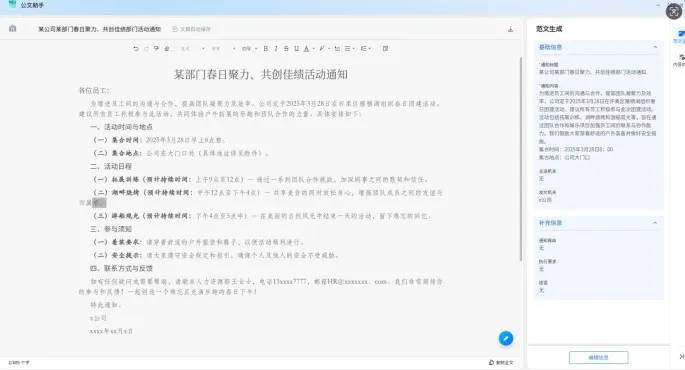 汇报通过后,精简下团建策划框架就可以使用公文写作模板生成部门通知,检查调整格式后完成发文。如此一来,轻轻松松就搞定了一系列繁冗耗时且易出错的文案工作。