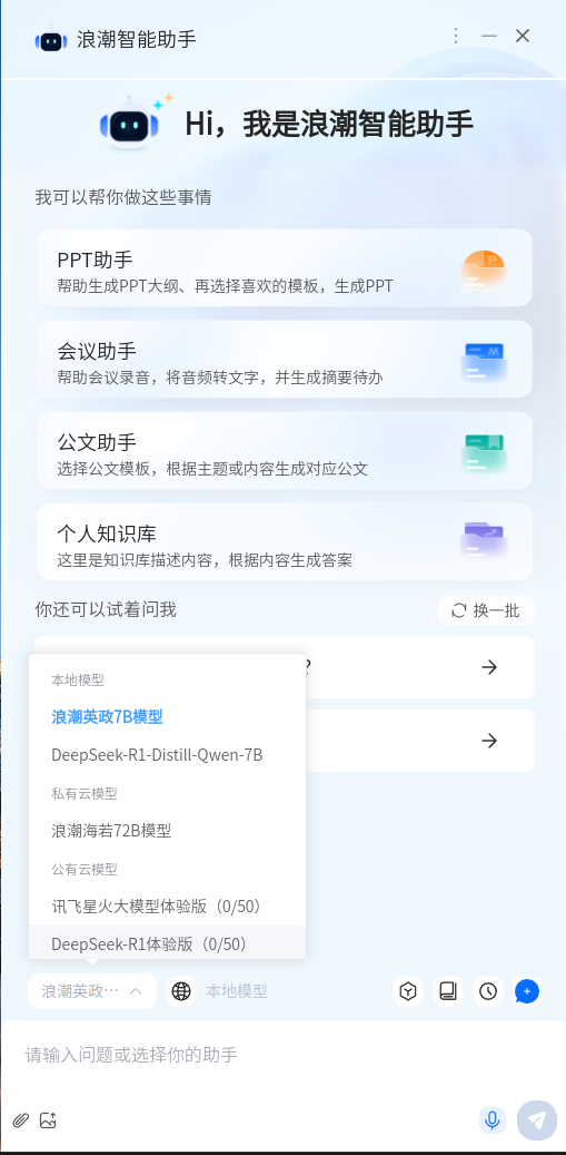 浪潮智能助手是浪潮英政智能计算机的智能中枢,它可以根据用户不同智能办公场景需要,适配不同的AI大模型,满足云端协同使用,轻松应对本地智能问答、知识库检索、公文写作、会议转写、智能PPT等多样化办公场景。从完全开放式的公有云智能办公方式,到利用大模型一体机部署的具备私密性的私有云智能办公方式,再到利用浪潮英政智能计算机部署的安全稳定高效的端侧智能办公方式,都可以帮助用户实现智能化办公。无论前述何种大模型部署方式,在浪潮智能助手的帮助下,常规公文撰写性质的工作,均可通过指令驱动自动生成,效率提升数倍,将职场人士从重复劳动中解放出来,聚焦于高价值创新任务。