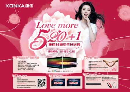 即将迎来“5·21”36周年厂庆的康佳,将于18号正式启动“5·20+1 love more”生日庆典。康佳本次怀着比“5·20”多一点、爱更浓一点的期望,寓意对顾客更多一分的关爱。康佳一路历经家电市场的残酷竞争与疯狂洗牌,依旧 能保持如今的行业引领者的地位,能取得今天的骄人成绩,离不了消费者对康佳的宽容与扶持,所以一年一度的周年庆典就是一次对消费者的馈赠。那么康佳此次究 竟会为消费者准备哪些爱更浓的惊喜呢?