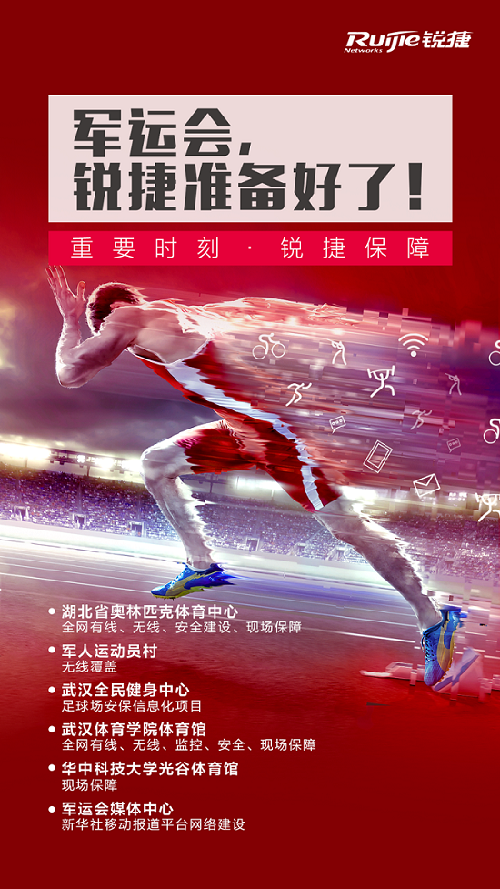 除此以外,锐捷也为武汉全民健身中心,华中科技大学光谷体育馆,军运会组委会翻译中心、接待中心及志愿者中心,武汉军运会安保通信保障支撑项目,军运会媒体中心新华社移动报道平台以及武汉东西湖部分场馆提供了完备的用网建设和服务保障。