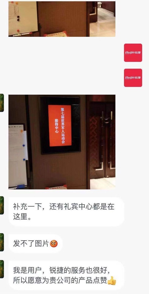 现场观众陈先生说:“在军运会组委会翻译中心、接待中心及志愿者中心、礼宾中心。都看到了锐捷的产品,我是用户,锐捷的服务也很好,愿意为锐捷点赞。”