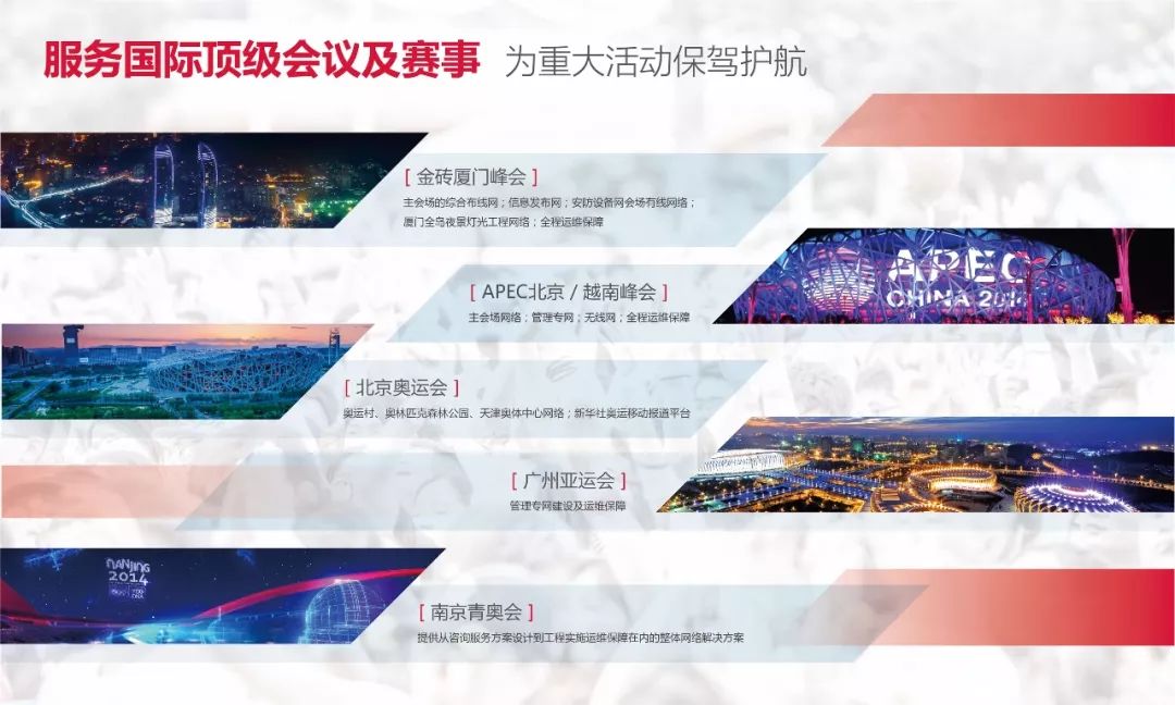 从北京奥运会、广州亚运会等重大赛事,到世界杯预选赛,再到腾讯合作伙伴大会、阿里云栖大会、苏宁之夏等大型活动的万人无线保障,以及厦门金砖峰会、APEC峰会、博鳌亚洲论坛、国际男篮男联世界杯等,锐捷网络都承担了重要的网络建设和保障任务,展现了锐捷的技术实力和看得见的好服务。